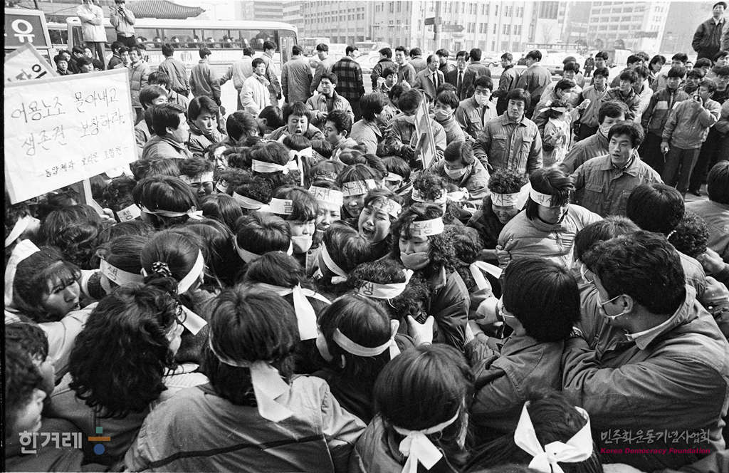 - 1989년 2월 9일 동양제과 노동조합 조합원들이 서울 세종문화회관에서 어용노조 반대외 부당해고 철회를 요구하며 집회를 가진 뒤 거리행진을 시도하다 경찰의 제제를 받고 있다.