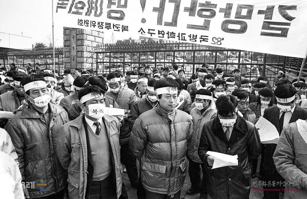 - 1989년 2월 9일 오후2시 82년 국방과학연구소 강제해직자 복권투쟁위원회 회원 3벽여명은 서울 용산구 용산동3가 국방부 정문앞에서 복직 및 명예회복을 요구하며 시위를 벌이고 있다.