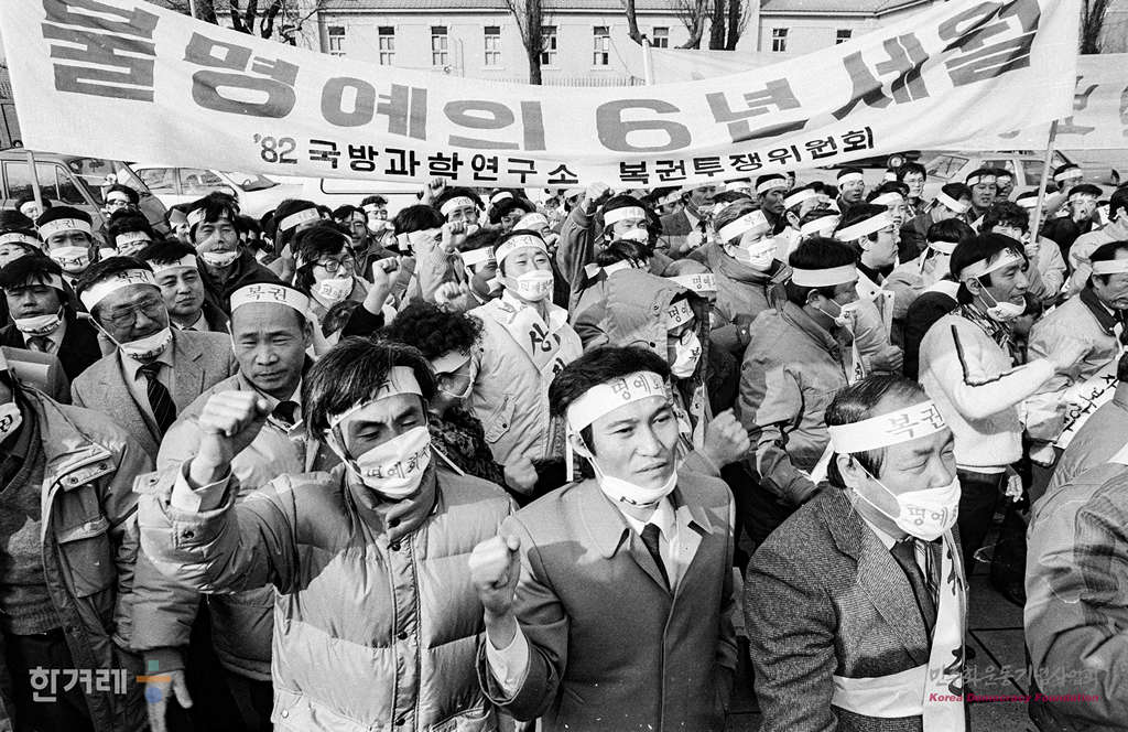 - 1989년 2월 9일 오후2시 82년 국방과학연구소 강제해직자 복권투쟁위원회 회원 3벽여명은 서울 용산구 용산동3가 국방부 정문앞에서 복직 및 명예회복을 요구하며 시위를 벌이고 있다.