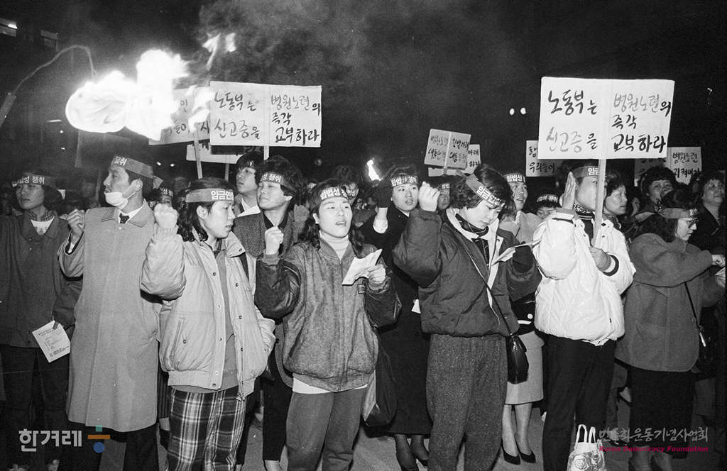 - 1989년 2월 10일 오후 6시 30분 전국병원노련 소속 노동자 5백여명은 서울 종로구 연건동 서울대병원 마당에서 병원노련 합법성 쟁취 및 임금인상투쟁 전진대회를 갖고 있다.