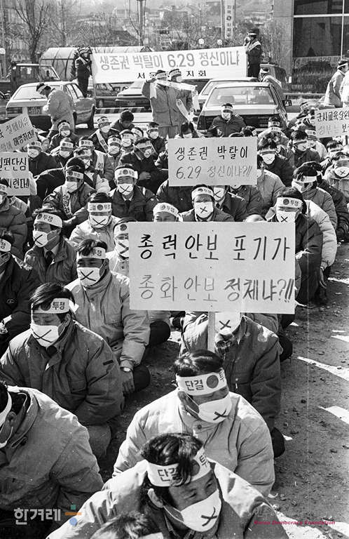 - 1989년 2월 10일 전국 대학교 교련교관들이 대학교 군사교육 과목이 폐지됨에 따라 서울 정부종합청사앞에서 교련폐지 반대를 주장하며 시위를 벌이고 있다.