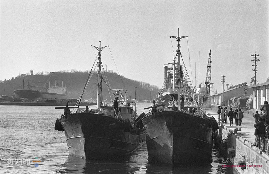 - 1989년 2월 12일 오후 3시20분 지난달 28일 백령도 부근에서 조업중 납북됐던 인천항 선전 제 37,38 태양호 두 어선과 선원 22명이 15일만에 인천항으로 귀환한 선원들이 마중나온 가족에게 손을 흔들며 재회를 하고 있다.
