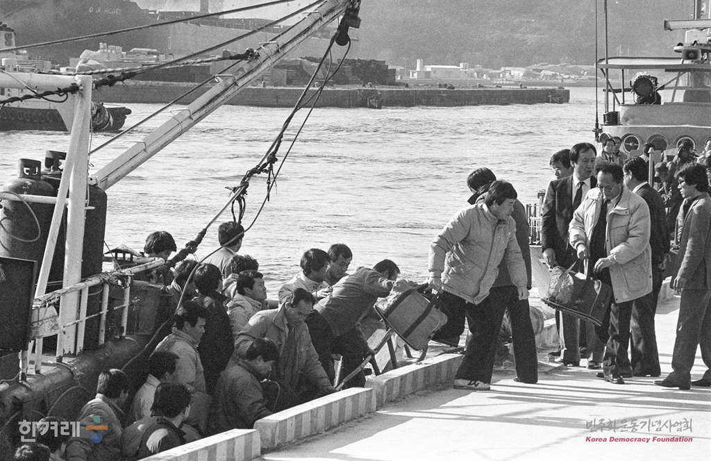 - 1989년 2월 12일 오후 3시20분 지난달 28일 백령도 부근에서 조업중 납북됐던 인천항 선전 제 37,38 태양호 두 어선과 선원 22명이 15일만에 인천항으로 귀환한 선원들이 마중나온 가족에게 손을 흔들며 재회를 하고 있다.