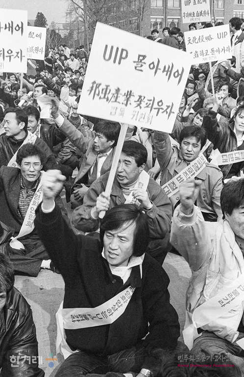 - 1989년 2월 13일 오전 11시 한국 영화인협회 소속 회원 감독 배우 시나리오 작가 등 3벽여명은 서울 종로구 동숭동 예총회관에서 미국UIP영화직배저지 범영화인 총궐기대회를 갖고 평화행진을 하고 있다.