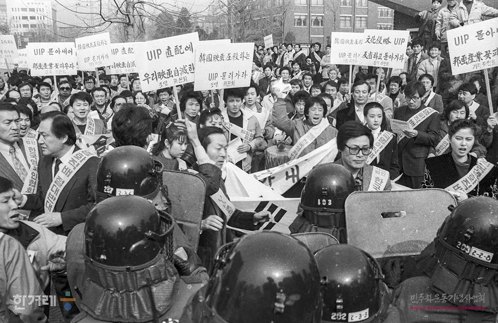 - 1989년 2월 13일 오전 11시 한국 영화인협회 소속 회원 감독 배우 시나리오 작가 등 3벽여명은 서울 종로구 동숭동 예총회관에서 미국UIP영화직배저지 범영화인 총궐기대회를 갖고 평화행진을 하고 있다.