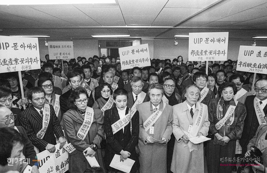- 1989년 2월 13일 오전 11시 한국 영화인협회 소속 회원 감독 배우 시나리오 작가 등 3벽여명은 서울 종로구 동숭동 예총회관에서 미국UIP영화직배저지 범영화인 총궐기대회를 갖고 평화행진을 하고 있다.