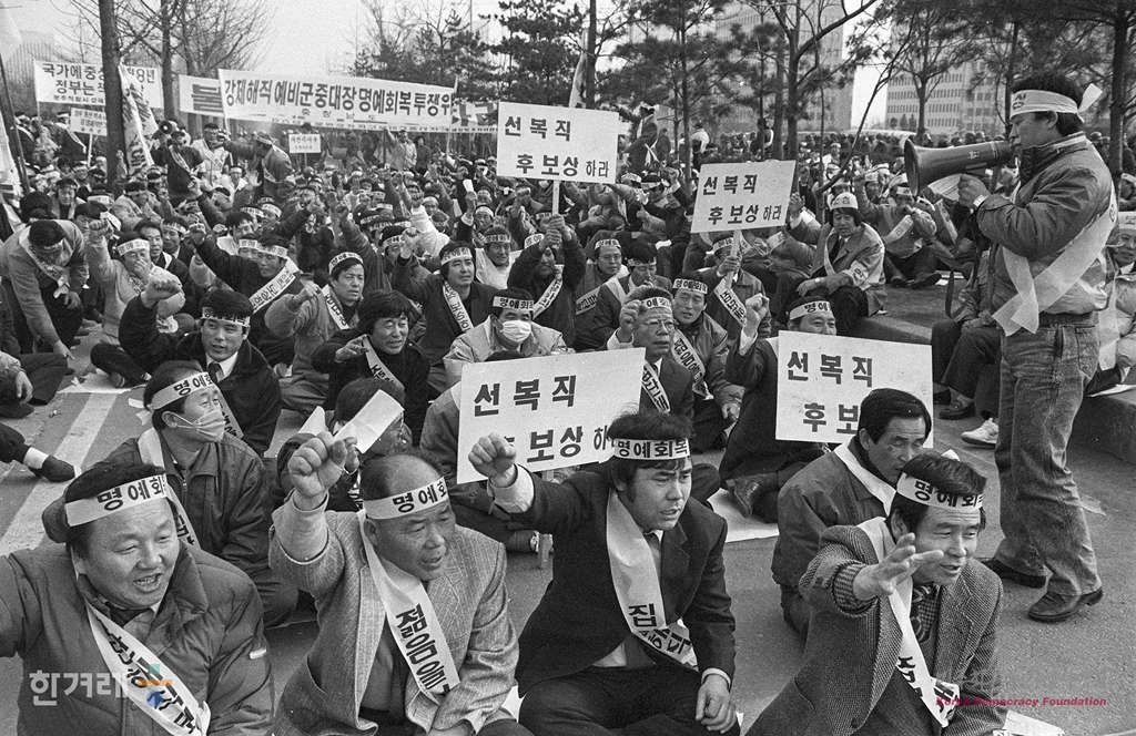 - 1989년 2월 14일 오후2시 80년대 해직예비군중대장 권익회복추진위원회 소속 회원 1천여명은 서울 영등포구 여의도동 국회의사당 정문앞에서 불법 강제해직조치 취소 및 명예회복 보상 등을 주장하며 시위를 벌이고 있다.
