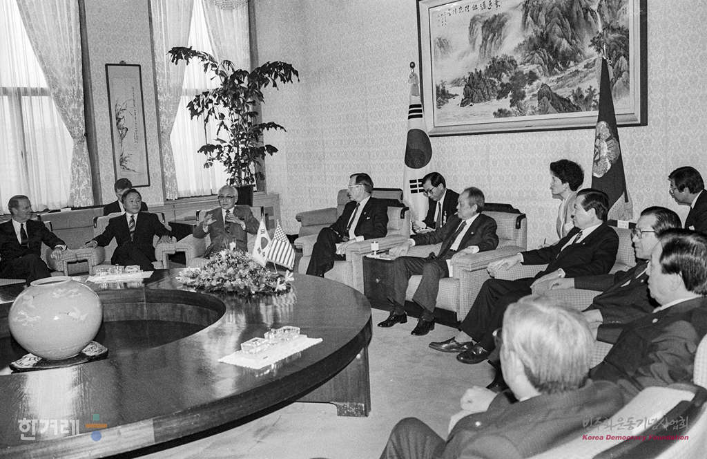 - 1989년 2월 27일 부시 미 대통령이 한미정상회담을 마친 뒤 국회를 방문해 김재순 국회의장을 비롯한 의장단과 박준규 민정당 대표위원 김대중 평민, 김영삼 민주, 김종필 공화당 총재 등 4당 대표와 원내총무 등과 자리를 하고 있다.