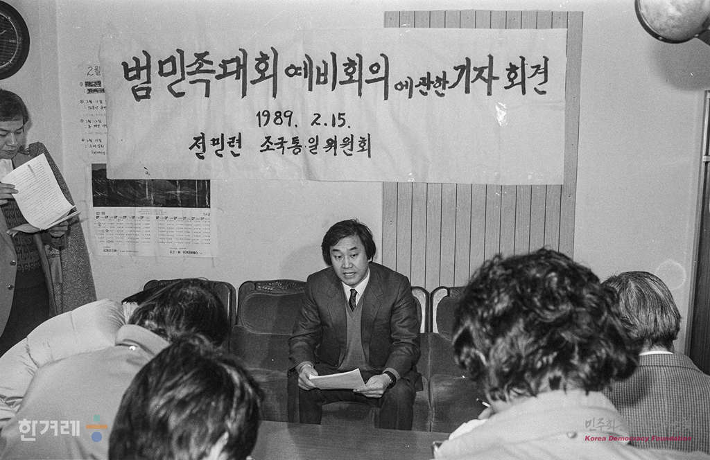- 1989년 2월 15일 전국민족민주운동연합 조국통일위원회는 서울 중구 삼각동 사무실에서 기자회견을 갖고 오는 3월 1일 판문점 남쪽 지역인 평화의 집에서 갖기로 북한쪽에 제안한 범민족대회 예비회의에 참가할 남쪽대표자 명단과 의제 등에 대해 발표하고 있다.