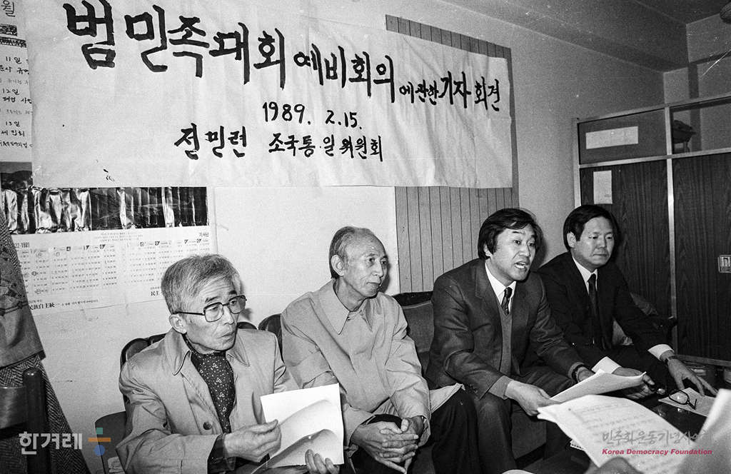 - 1989년 2월 15일 전국민족민주운동연합 조국통일위원회는 서울 중구 삼각동 사무실에서 기자회견을 갖고 오는 3월 1일 판문점 남쪽 지역인 평화의 집에서 갖기로 북한쪽에 제안한 범민족대회 예비회의에 참가할 남쪽대표자 명단과 의제 등에 대해 발표하고 있다.