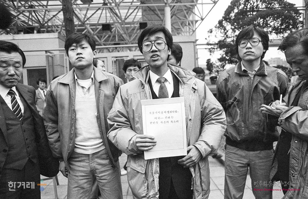 - 1989년 2월 15일 서울지역 총학생회연합 임시부위원장 정재훈씨 등 대학생 12명은 서울 종로구 세종로 미대사관을 찾아가 팀스피리트훈련 중단 부시방한 중지 그레그 신임 미 대사 부임반대 등의 내용을 담은 한민족 자존의 목소리라는 제목의 서한을 전달한 뒤 모두 연행되고 있다.