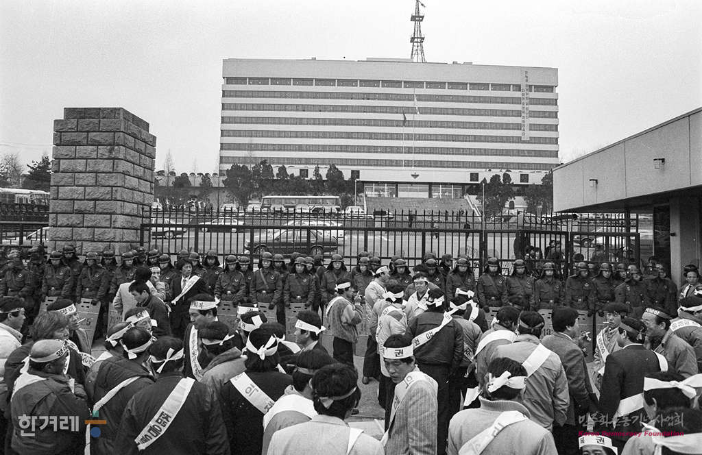 - 1989년 2월 15일 오전 10시20분 80년초 강제해직된 예비군중대장들이 전날에 이어 서울 용산 국방부 정문앞에서 복직과 보상을 요구하며 농성을 벌이고 있다.