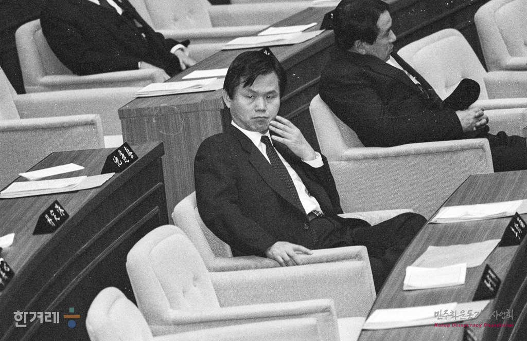 - 1989년 2월 15일 국회 통일 외교 안보분야 대정부질문에서 여야의원들의 집중비난을 받은 밀실외교의 주인공 격인 박철언 의원이 국회 본회의장에서 박준규 민정당 대표와 밀담을 나누고 있다.
