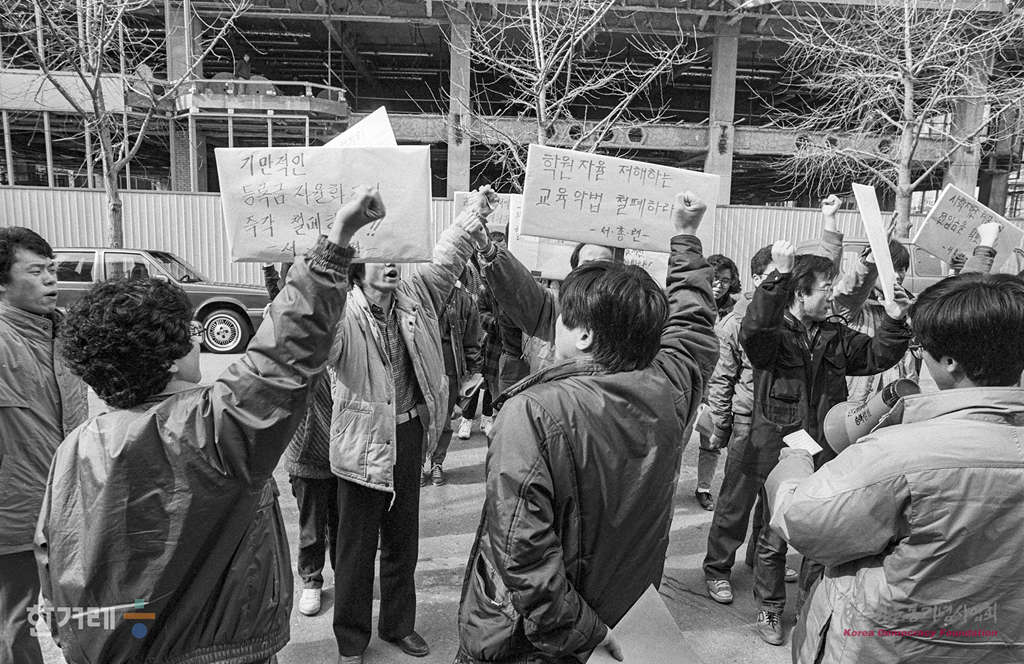 - 1989년 2월 17일 서울지역 총학생회연합 임시부위원장 정재훈씨를 비롯한 대학생들이 서울 정부종합청사 후문에서 교육쟈종 확보와 등록금인상을 받대하는 서한을 교육부에 전달하기에 앞서 시위를 벌이고 있다.
