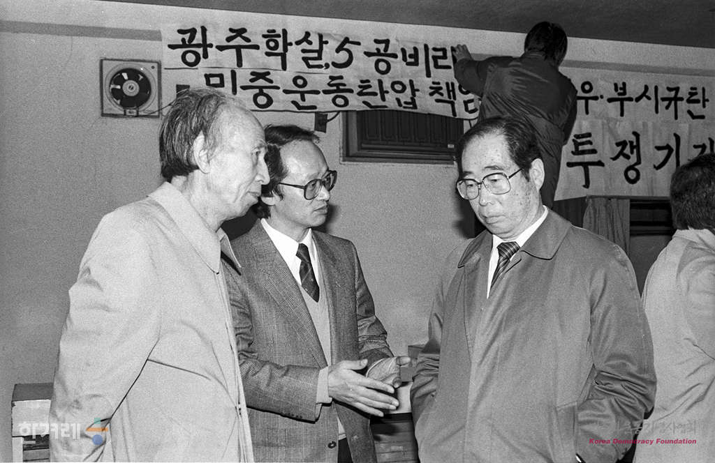 - 1989년 2월 17일 전국민족민주운동연합은 서울 중구 명동 향린교회에서 노태우 대통령 취임 1주년과 부시 미 대통령의 방한을 맞아 18일부터 27일가지 광주학살 5공비리 민중생존권 탄압 책임자 노태우 부시 규탄 국민투쟁기간으로 설정하고 각종 국민대회와 시위를 벌이기로 했다며 기자회견을 하고 있다.