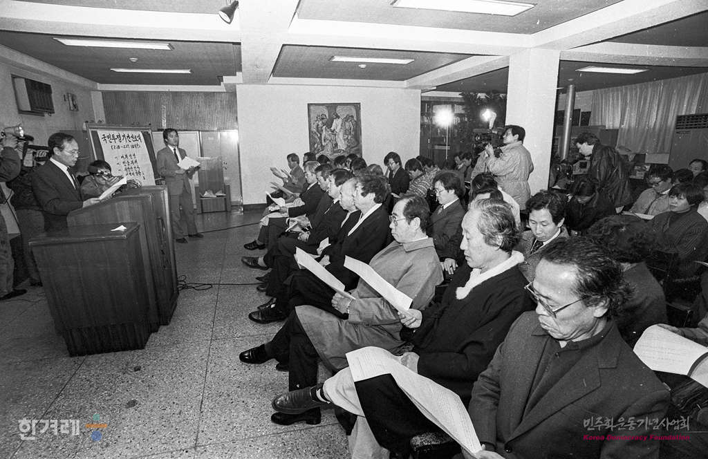 - 1989년 2월 17일 전국민족민주운동연합은 서울 중구 명동 향린교회에서 노태우 대통령 취임 1주년과 부시 미 대통령의 방한을 맞아 18일부터 27일가지 광주학살 5공비리 민중생존권 탄압 책임자 노태우 부시 규탄 국민투쟁기간으로 설정하고 각종 국민대회와 시위를 벌이기로 했다며 기자회견을 하고 있다.