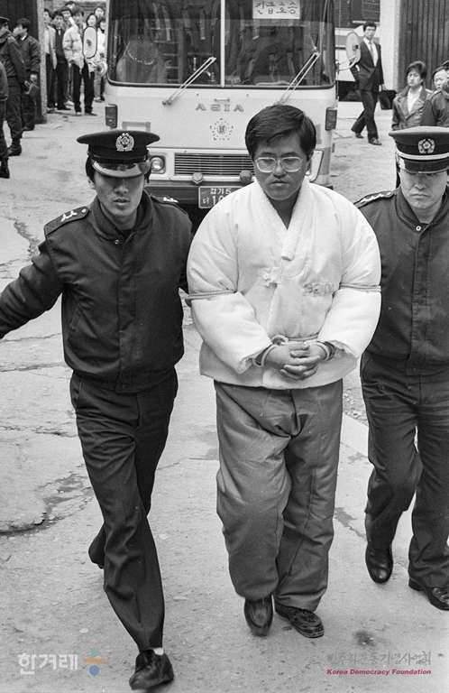 - 1989년 2월 17일 노량진수산시장 운영권 강탈혐의로 구속기소된 전두환씨의 친형 전기환씨와 회사돈을 빼돌리고 탈세한 혐의로 구속기소된 전두환씨의 처남 이창석씨의 첫 공판을 받기 위해 서울지법 남부지원 법정으로 들어서고 있다.