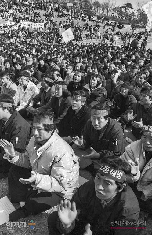 - 1989년 2월 19일 오후2시 전국 노동법개정 및 임금인상 투쟁본부 주최로 서울 종로구 동숭동 대학로에서 열릴 예정이던 노동운동탄압 분쇄 및 노동악법 반민주악법 철폐를 위한 전국노동자 궐기대회가 경찰의 원천봉쇄로 열리지 못하자 성균관대학교 금잔디광장에서 궐기대회를 열려 결의를 다지고 있다. 궐기대회가 끝난 뒤 명동 일대에서 산발적인 시위와 농성을 벌였고 경찰은 1만 3천여명의 병력을 동원 시위 관련자 1천7백69명을 연행했다.
