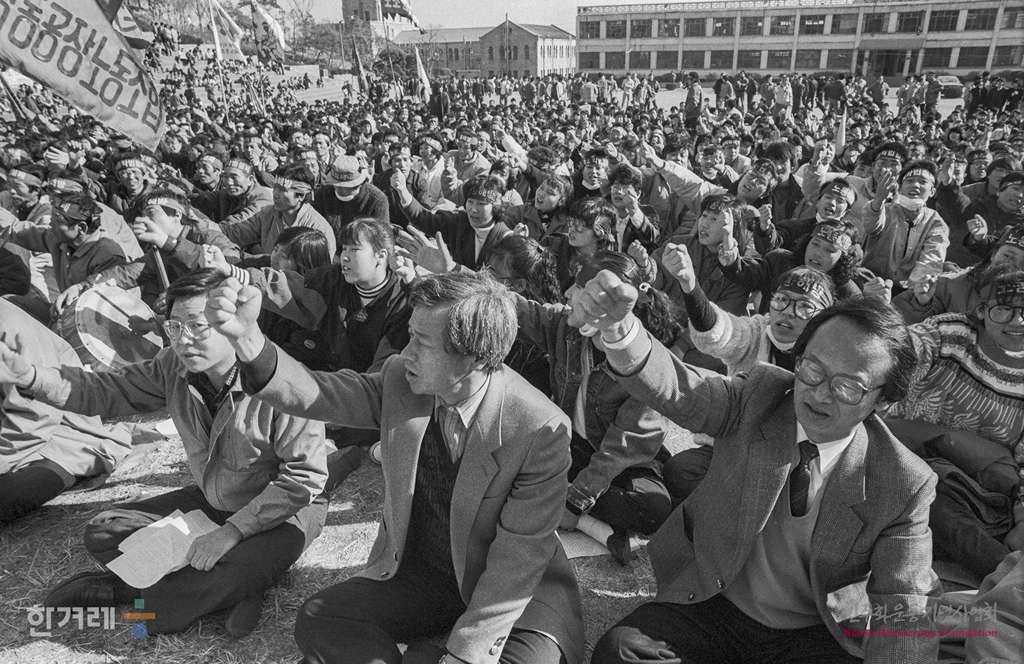 - 1989년 2월 19일 오후2시 전국 노동법개정 및 임금인상 투쟁본부 주최로 서울 종로구 동숭동 대학로에서 열릴 예정이던 노동운동탄압 분쇄 및 노동악법 반민주악법 철폐를 위한 전국노동자 궐기대회가 경찰의 원천봉쇄로 열리지 못하자 성균관대학교 금잔디광장에서 궐기대회를 열려 결의를 다지고 있다. 궐기대회가 끝난 뒤 명동 일대에서 산발적인 시위와 농성을 벌였고 경찰은 1만 3천여명의 병력을 동원 시위 관련자 1천7백69명을 연행했다.