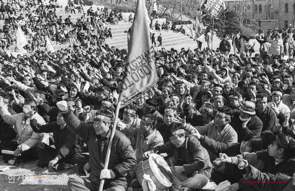 - 1989년 2월 19일 오후2시 전국 노동법개정 및 임금인상 투쟁본부 주최로 서울 종로구 동숭동 대학로에서 열릴 예정이던 노동운동탄압 분쇄 및 노동악법 반민주악법 철폐를 위한 전국노동자 궐기대회가 경찰의 원천봉쇄로 열리지 못하자 성균관대학교 금잔디광장에서 궐기대회를 열려 결의를 다지고 있다. 궐기대회가 끝난 뒤 명동 일대에서 산발적인 시위와 농성을 벌였고 경찰은 1만 3천여명의 병력을 동원 시위 관련자 1천7백69명을 연행했다.