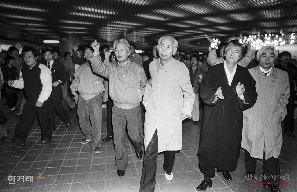 - 1989년 2월 18일 전민련이 18일부터 27일까지 설정한 광주학살 5공비리 민중생존권 탄압책임자 노태우 부시규탄 국민투쟁기간의 첫집회인 서울 종로구 동숭동 대학로에서 열기로 한 서울민족민주운동협의회 및 서총련 주최 서울시민결의대회가 경찰의 강경한 원천봉쇄로 열리지 못하자 백기완 소장을 비롯한 재야단체 인사들과 학생 노동자 시민들이 서울 을지로입구에 모여 항의집회를 하고 있다.