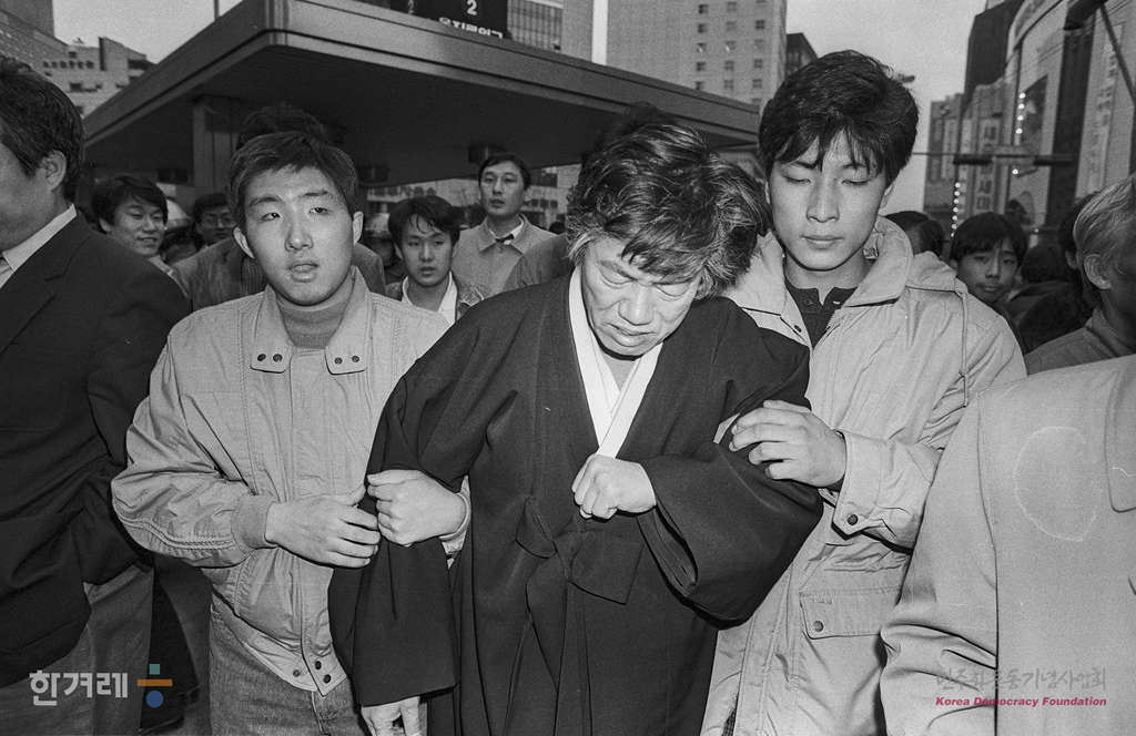 - 1989년 2월 18일 전민련이 18일부터 27일까지 설정한 광주학살 5공비리 민중생존권 탄압책임자 노태우 부시규탄 국민투쟁기간의 첫집회인 서울 종로구 동숭동 대학로에서 열기로 한 서울민족민주운동협의회 및 서총련 주최 서울시민결의대회가 경찰의 강경한 원천봉쇄로 열리지 못하자 백기완 소장을 비롯한 재야단체 인사들과 학생 노동자 시민들이 서울 을지로입구에 모여 항의집회를 하고 있다.