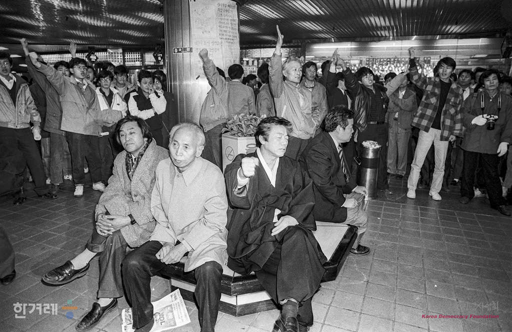 - 1989년 2월 18일 전민련이 18일부터 27일까지 설정한 광주학살 5공비리 민중생존권 탄압책임자 노태우 부시규탄 국민투쟁기간의 첫집회인 서울 종로구 동숭동 대학로에서 열기로 한 서울민족민주운동협의회 및 서총련 주최 서울시민결의대회가 경찰의 강경한 원천봉쇄로 열리지 못하자 백기완 소장을 비롯한 재야단체 인사들과 학생 노동자 시민들이 서울 을지로입구에 모여 항의집회를 하고 있다.
