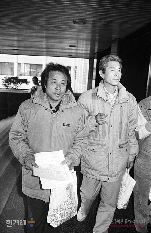 - 1989년 2월 18일 지난 14일 여의도 농민시위와 관련해 검찰과 경찰이 수사를 벌이고 있는 가운데 경기도 생존권대책위원장 정수일씨와 전국수세폐지대책위원회 전남위원장 대행 이용섭씨가 검찰에 자진출두하고 있다.