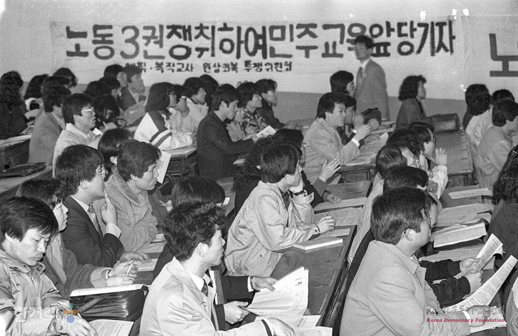 - 1989년 2월 19일 전국교사협의회가 서울 단국대 학생극장에서 전체대의원대회를 열고 교원노조 건설을 만장일치로 의결하고 있다.