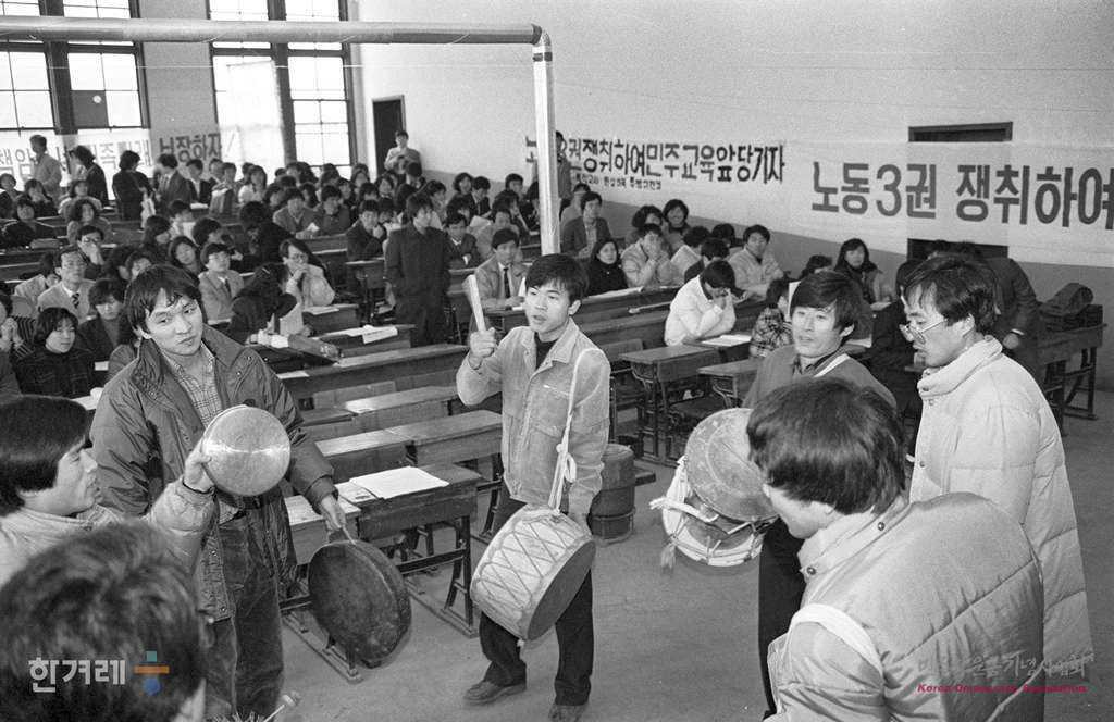- 1989년 2월 19일 전국교사협의회가 서울 단국대 학생극장에서 전체대의원대회를 열고 교원노조 건설을 만장일치로 의결하고 있다.