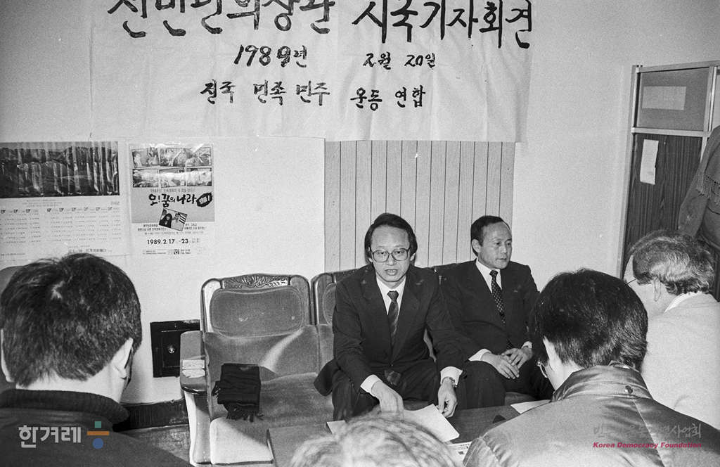 - 1989년 2월 20일 전민련의 이부영 이창복 공동대표는 서울 중구 삼각동 사무실에서 지난 18,19일 대학로 집회에 대한 정부 당국의 강경탄압을 규탄하는 기자회견을 갖고 있다.