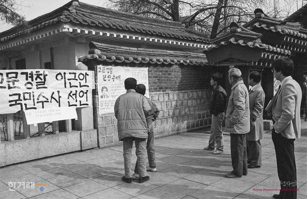 - 1989년 2월 21일 민가협 회원들이 고문경찰관 이근안 경감을 현상 수배한 뒤 서울 파고다공원 등지에서 수배전단을 시민들에게 나눠주고 있다. 민가협과 전민련 인권위는 현상금을 1백만원으로 정해 공개모금하고 모금액이 1백만원을 넘더라도 전액 제보자에게 주기로 했다.