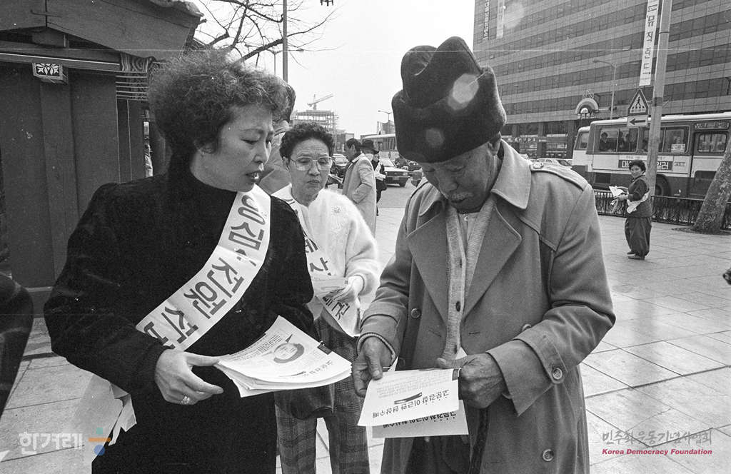 - 1989년 2월 21일 민가협 회원들이 고문경찰관 이근안 경감을 현상 수배한 뒤 서울 파고다공원 등지에서 수배전단을 시민들에게 나눠주고 있다. 민가협과 전민련 인권위는 현상금을 1백만원으로 정해 공개모금하고 모금액이 1백만원을 넘더라도 전액 제보자에게 주기로 했다.