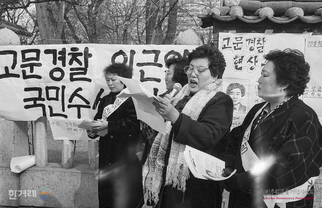 - 1989년 2월 21일 민가협 회원들이 고문경찰관 이근안 경감을 현상 수배한 뒤 서울 파고다공원 등지에서 수배전단을 시민들에게 나눠주고 있다. 민가협과 전민련 인권위는 현상금을 1백만원으로 정해 공개모금하고 모금액이 1백만원을 넘더라도 전액 제보자에게 주기로 했다.