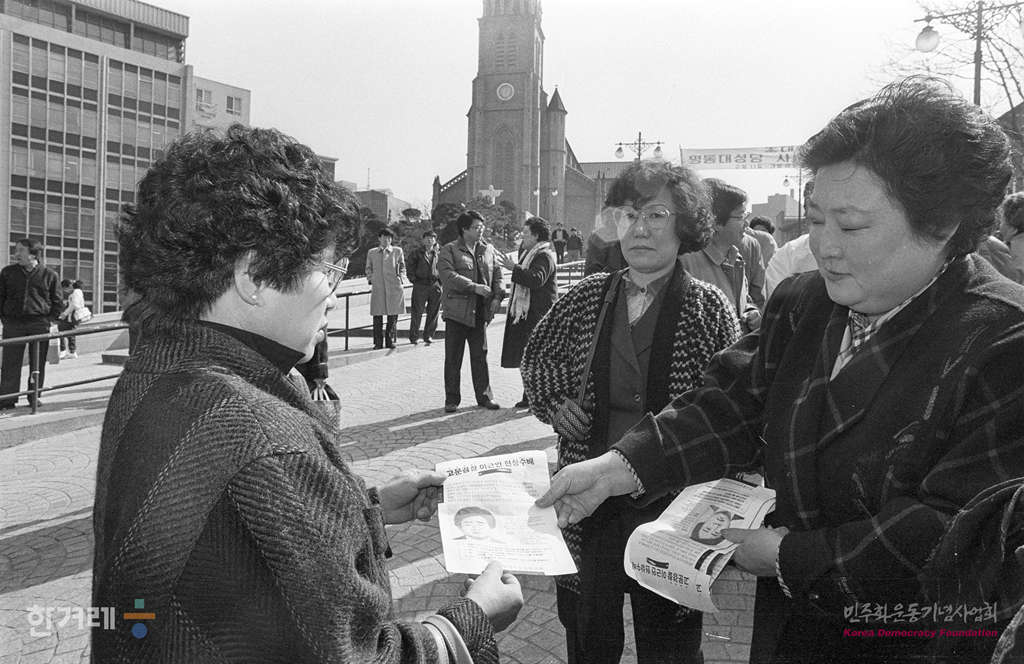 - 1989년 2월 21일 민가협 회원들이 고문경찰관 이근안 경감을 현상 수배한 뒤 서울 명동성당앞에서 수배전단을 시민들에게 나눠주고 있다. 민가협과 전민련 인권위는 현상금을 1백만원으로 정해 공개모금하고 모금액이 1백만원을 넘더라도 전액 제보자에게 주기로 했다.