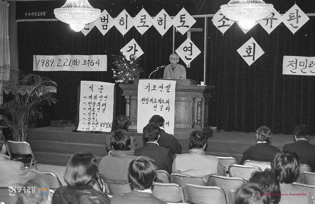 - 1989년 2월 21일 전민련 주최로 전범히로히토 조문규탄 강연회가 서울 기독교회관 강당에서 열려 계훈제끼사 인사말을 하고 있다.