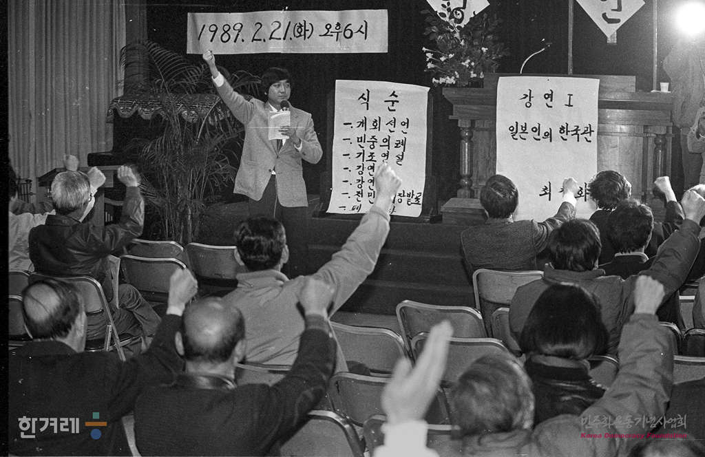 - 1989년 2월 21일 전민련 주최로 전범히로히토 조문규탄 강연회가 서울 기독교회관 강당에서 열려 계훈제끼사 인사말을 하고 있다.