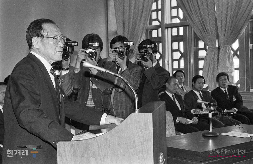 - 1989년 2월 22일 국회 외무통일위에 참석한 정주영 현대그룹 명예회장은 북한방문 경위에 대해 참고인 진술을 하고 있다.