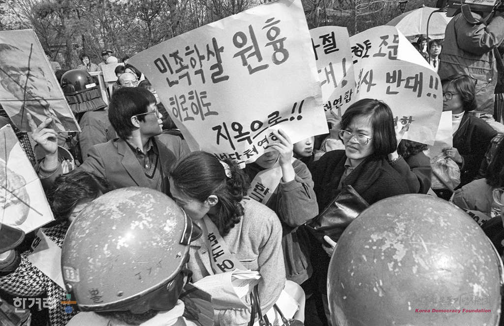 - 1989년 2월 22일 낮 12시 한국여성단체연합 회원들과 시민들이 서울 종로2가 파고다공원앞에서 히로히토 조문사절 파견 규탄대회를 갖고 있다.