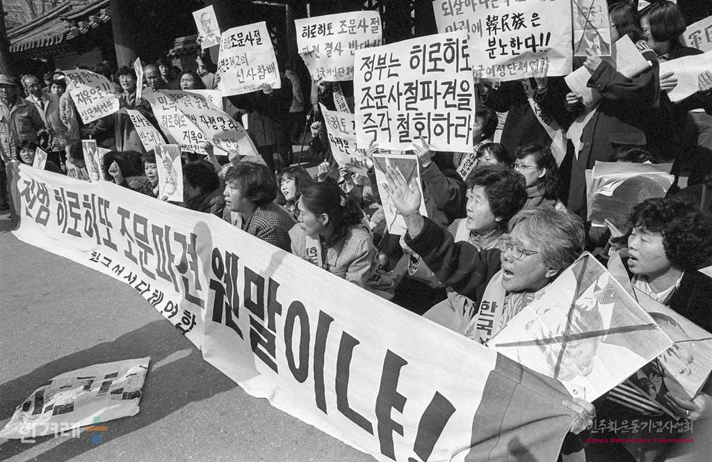- 1989년 2월 22일 낮 12시 한국여성단체연합 회원들과 시민들이 서울 종로2가 파고다공원앞에서 히로히토 조문사절 파견 규탄대회를 갖고 있다.