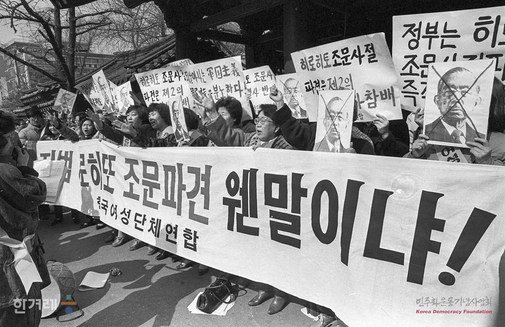 - 1989년 2월 22일 낮 12시 한국여성단체연합 회원들과 시민들이 서울 종로2가 파고다공원앞에서 히로히토 조문사절 파견 규탄대회를 갖고 있다.