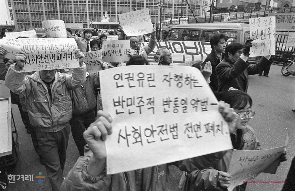 - 1989년 2월 23일 1시 서울민족민주운동협의회 소속단체 회원 1백여명은 서울 중구 명동성당 입구에서 사회안전법 철폐를 위한 가두단식투쟁을 지지하는 집회를 갖은 뒤 손팻말 시위를 벌이고 있다. 이들은 오후 3시 공화당사를 방문해 사회안전법 개정을 존치하려는 공화당의 방침을 철회할 것을 주장하며 김종필 총재와의 공개면담을 요구했다.