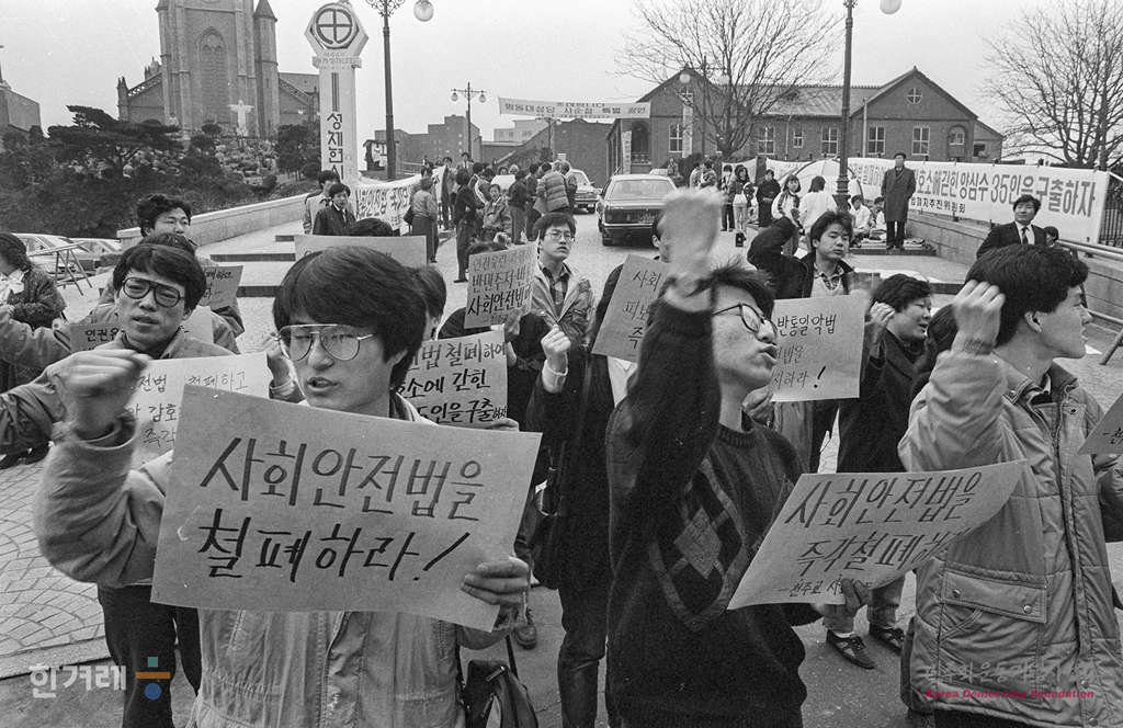 - 1989년 2월 23일 1시 서울민족민주운동협의회 소속단체 회원 1백여명은 서울 중구 명동성당 입구에서 사회안전법 철폐를 위한 가두단식투쟁을 지지하는 집회를 갖은 뒤 손팻말 시위를 벌이고 있다. 이들은 오후 3시 공화당사를 방문해 사회안전법 개정을 존치하려는 공화당의 방침을 철회할 것을 주장하며 김종필 총재와의 공개면담을 요구했다.