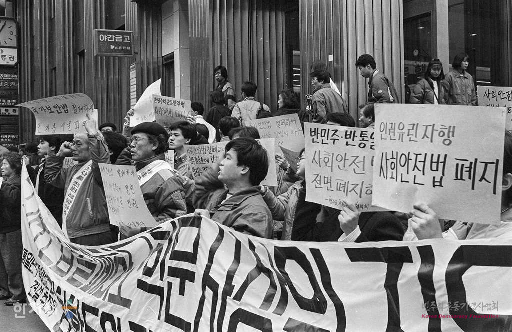 - 1989년 2월 23일 1시 서울민족민주운동협의회 소속단체 회원 1백여명은 서울 중구 명동성당 입구에서 사회안전법 철폐를 위한 가두단식투쟁을 지지하는 집회를 갖은 뒤 손팻말 시위를 벌이고 있다. 이들은 오후 3시 공화당사를 방문해 사회안전법 개정을 존치하려는 공화당의 방침을 철회할 것을 주장하며 김종필 총재와의 공개면담을 요구했다.