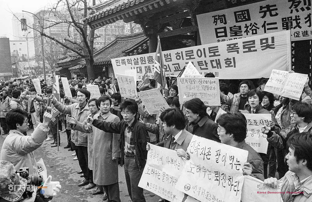 - 1989년 2월 24일 오후2시 민청련 등 9개 재야 청년단체와 민주노인회 및 전국 일어 일문 일어교육과 학생회연합회 회원 등 4백여명은 서울 종로구 파고다공원에서 ㅁ니족학살 원흉 전법 히로히토 폭로 및 사대매국외교 규탄대회를 갖고 조문사절 파견을 비난하는 시위를 벌이고 있다.