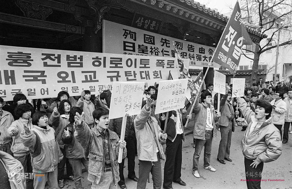 - 1989년 2월 24일 오후2시 민청련 등 9개 재야 청년단체와 민주노인회 및 전국 일어 일문 일어교육과 학생회연합회 회원 등 4백여명은 서울 종로구 파고다공원에서 민족학살 원흉 전법 히로히토 폭로 및 사대매국외교 규탄대회를 갖고 조문사절 파견을 비난하는 시위를 벌이고 있다.
