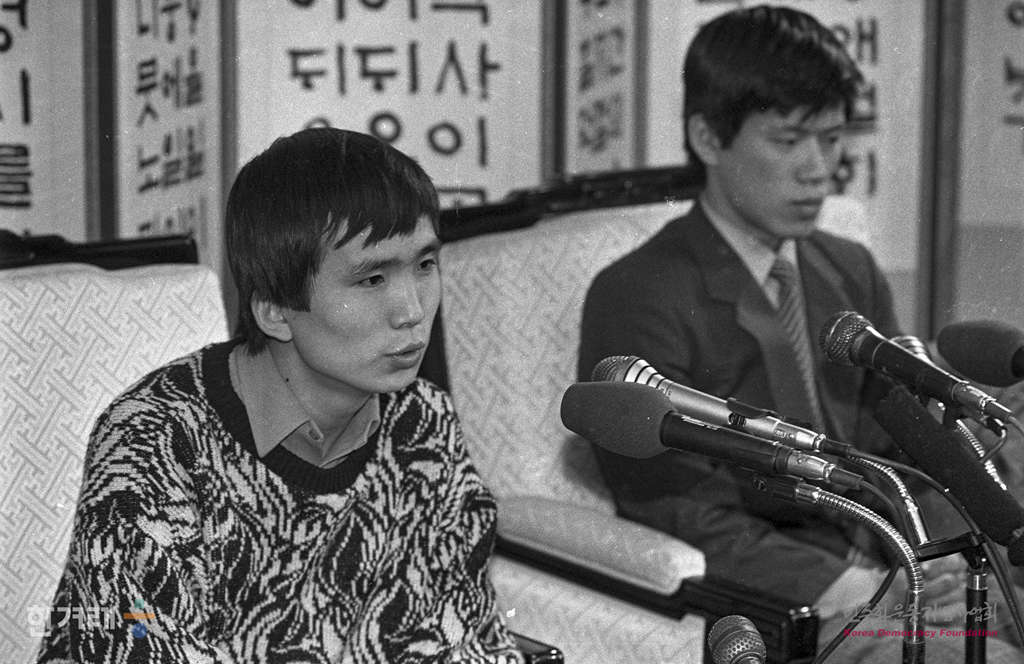 - 1989년 2월 25일 오후 6시 30분 북한의 체코슬로바키아 프라하에 있는 칼 대학 의학부 2학년에 재학중이던유학생 조승군씨와 김은철씨가 런던발 대한항공 908편으로 김포공항에 도착해 기자회견을 하고 있다.