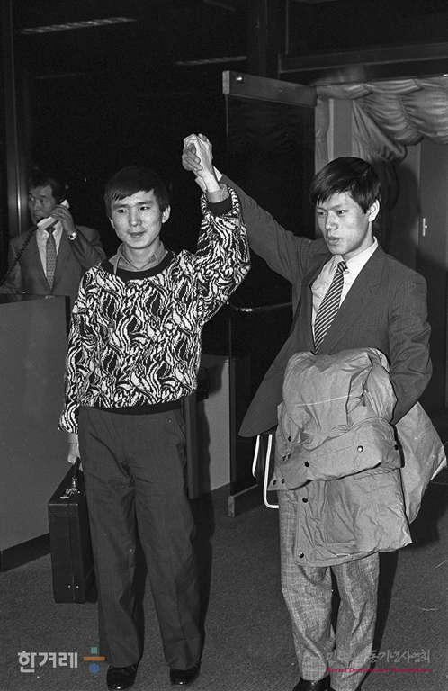 - 1989년 2월 25일 오후 6시 30분 북한의 체코슬로바키아 프라하에 있는 칼 대학 의학부 2학년에 재학중이던유학생 조승군씨와 김은철씨가 런던발 대한항공 908편으로 김포공항에 도착해 기자회견을 하고 있다.