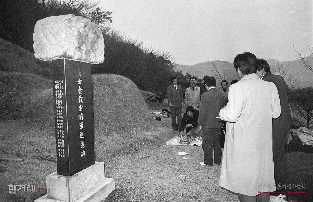 - 1989년 2월 25일 김재규 사망 9년이 지난 경기도 광주시 외곽 공원묘지 김재규 무덤에 유신철폐운동에 앞장섰던 지역 재야인사들의 모인인 광주 전남 송죽회 회원들이 김재규장군 추모비라고 적힌 묘비를 세우고 있다.