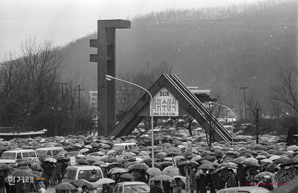 - 1989년 2울 25일 서울대 졸업생과 학부모들이 총학생회와 졸업준비위원회가 교내 아크로폴리스 광장에서 졸마련한 졸업생 한마당을 가진 뒤 등록금 동결과 총학생회의 졸업식 참여, 총학장 직전제, 교원임용보장을 요구하며 대운동장으로 행진 졸업식에 참석하고 있다.